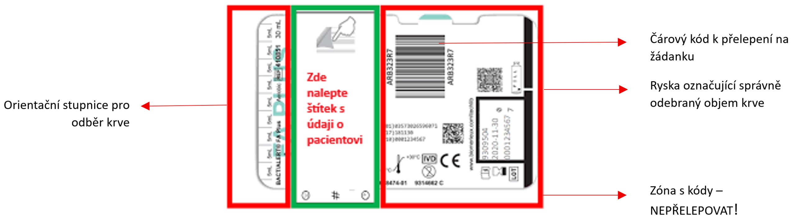 - Před inokulací lahvičku označte štítkem (jméno pacienta, číslo pojištěnce, oddělení). Štítek nalepte na místo k tomu určené. Štítek nesmí překrýt čárový kód ani QR kódy na lahvičce. Nálepku s čárovým kódem z lahvičky přelepte na žádanku.